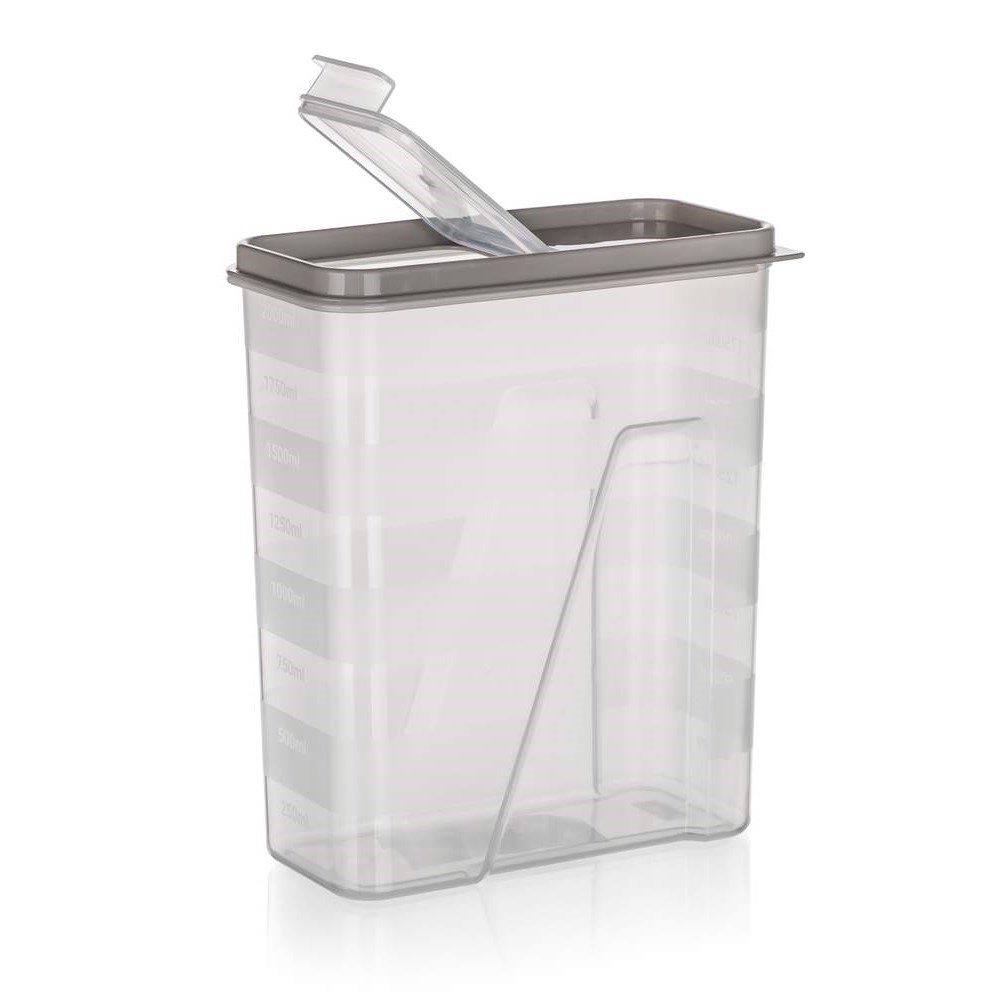 Transparentní dávkovací plastová dóza Culinaria o objemu 2 l, s víčkem v latte barvě. Dóza je praktickým pomocníkem na ukládání těstovin, luštěnin, mouky a jiných potravin. Opatřena měřící ryskou s odstupem 250 ml.