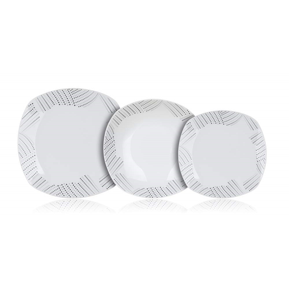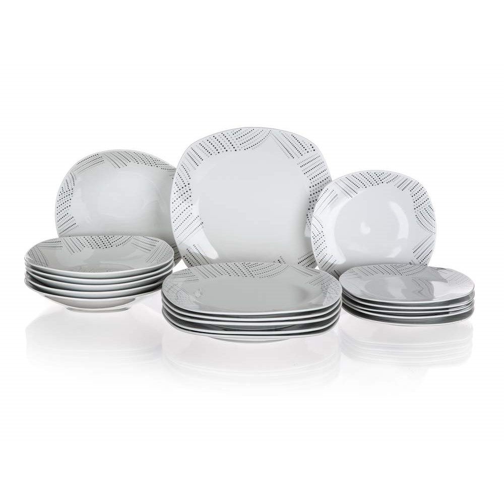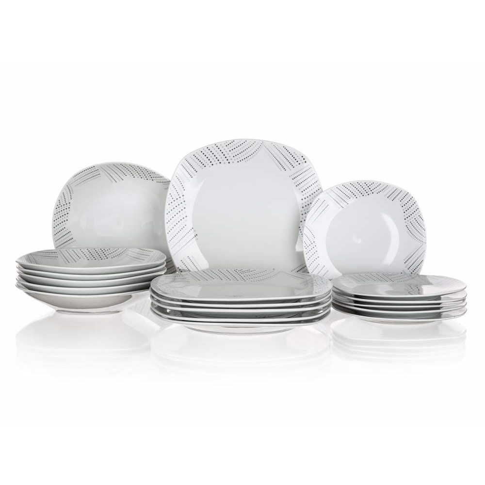 18dílná talířová sada square CHARME je vyrobena z porcelánu. Sada obsahuje 6x dezertní talíř (diagonála 20 cm, šířka 18,5 cm), 6x hluboký talíř (diagonála 23 cm, šířka 22 cm) a 6x mělký talíř (diagonála 27 cm, šířka 25 cm). Talíře lze používat do mikrovlnné trouby a mýt v myčce na nádobí.